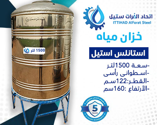 خزان مياه استانلس استيل سعة1500لتر اسطوانى رأسى