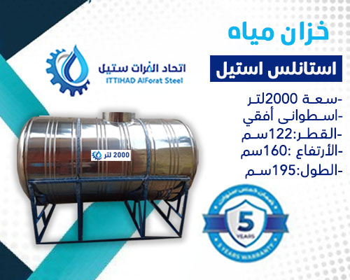 خزان مياه استانلس استيل سعة 2000لتر اسطوانى أفقى