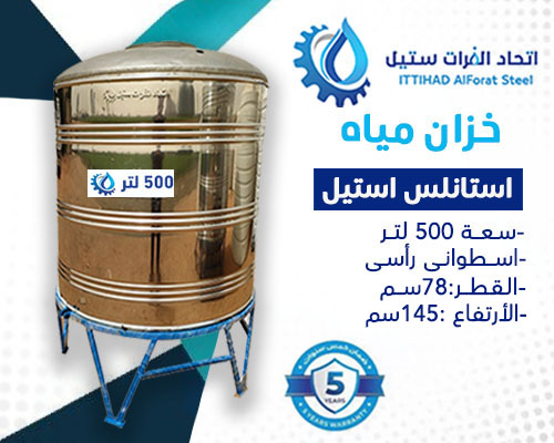 خزان مياه استانلس استيل سعة 500لتر اسطوانى رأسى