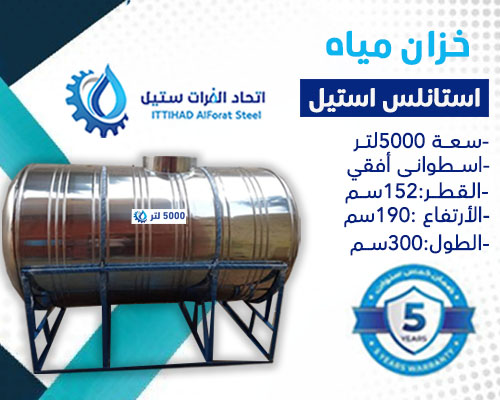 خزان مياه استانلس استيل سعة5000 لتر اسطوانى افقى